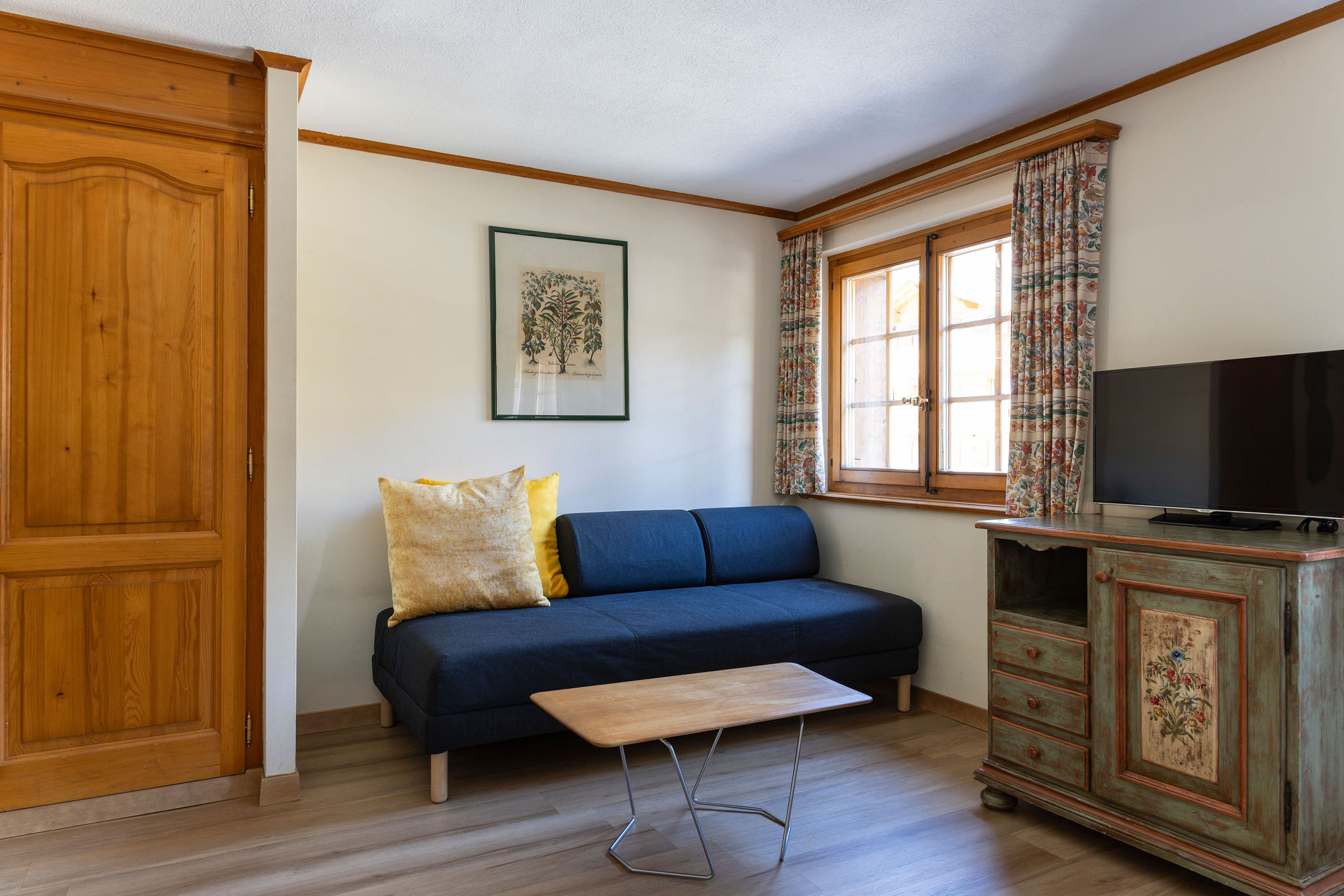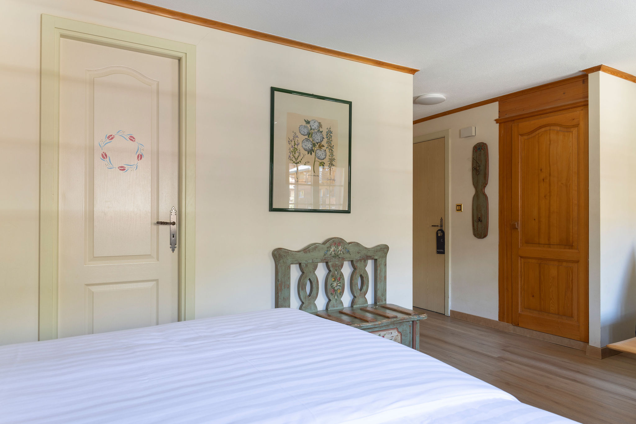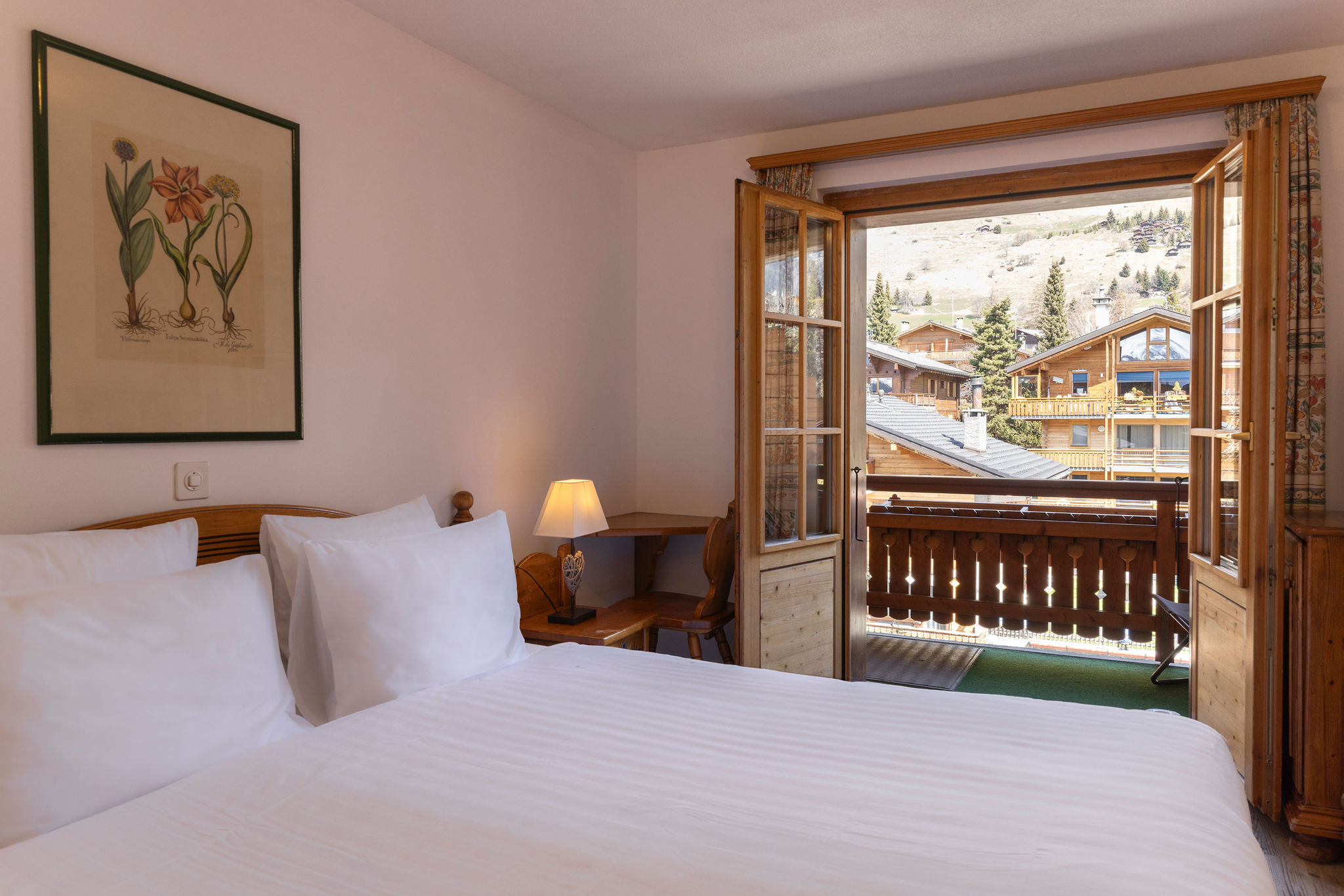 Ein warmer und freundlicher Raum, der das Hotel und seine Mitarbeiter widerspiegelt, mit viel Tageslicht und offenem Blick nach außen. Genießen Sie die herrliche Aussicht von Ihrem Bett aus: auf schneebedeckte Bergkämme oder grüne Tannenwipfel, je nachdem, welche Jahreszeit Sie bevorzugen.
